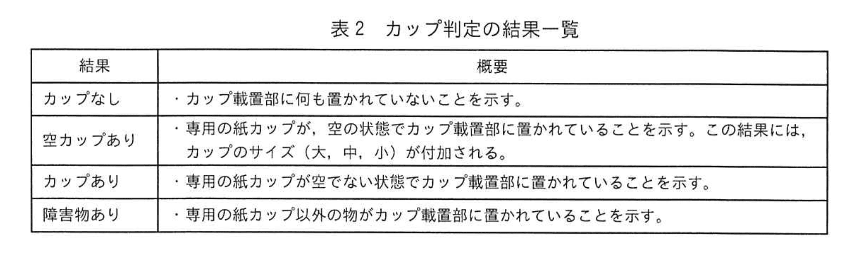 カップ判定は、利用者がドアを閉じた時に、カメラでカップ載置台を複数回撮影して行う。カップ判定の結果一覧を、表2に示す。