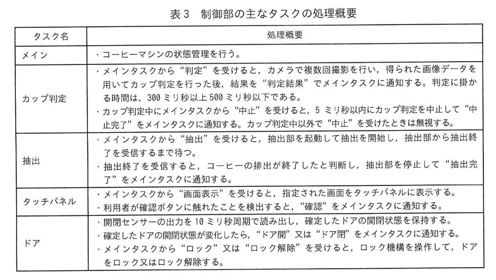 - さらに、表3でカップ判定タスクは「カップ判定中にメインタスクから“中止”を受けると、5ミリ秒以内にカップ判定を中止して“中止完了”をメインタスクに通知」と規定されています。