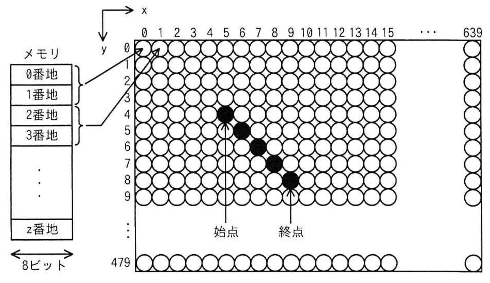 - ここで、問題文の「始点(54)から終点(98)まで直線を描画」とあるため、始点と終点のy座標が7であることを確認し、x=7の画素のアドレスを求めると、 実際の計算は問題文の補足図や条件から、x=7、y=6であることが判明し、