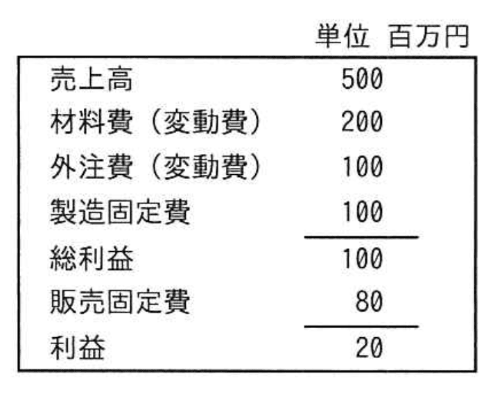 - 根拠:損益分岐点は「固定費÷限界利益率」で求め、固定費は製造固定費+販売固定費の合計180百万円、限界利益率は総利益÷売上高=100/500=0.2。