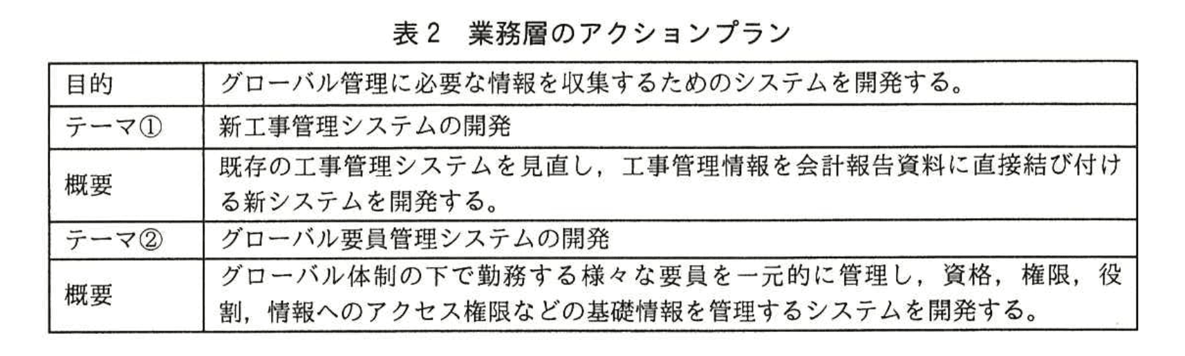 【表2】のテーマ②で「グローバル要員管理システムの開発」を掲げ、