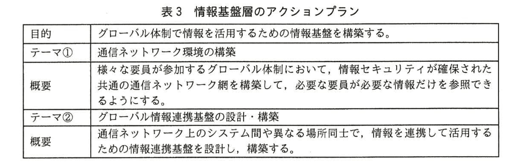 - 表3には「情報セキュリティが確保された共通の通信ネットワーク網を構築して、必要な要員が必要な情報だけを参照できるようにする。」とあります。