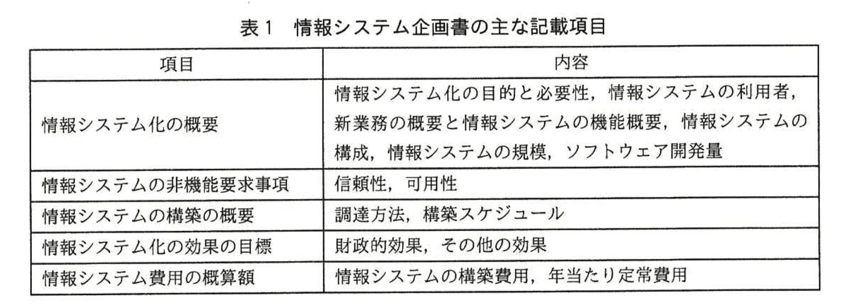 ① 主管課は、必要な情報システム投資に関する情報システム企画書を作成して、情報政策課へ提出する。情報システム企画書の主な記載項目は表1のとおりである。