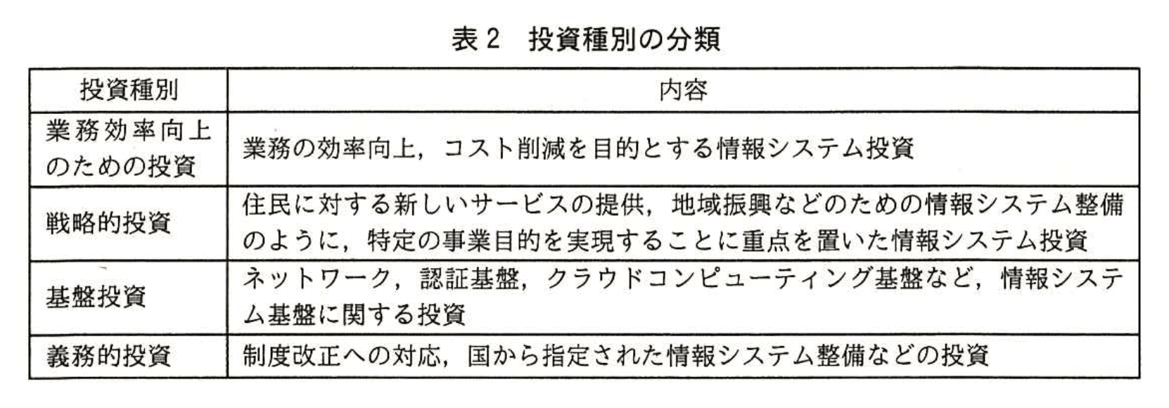 ・情報システムに関する企画審査は、表2に示す四つの投資種別に分類して行う。投資対効果の評価における基準値は、投資種別によって異なる。また、“業務効率向上のための投資”を除き、“財政的効果”は考慮していない。