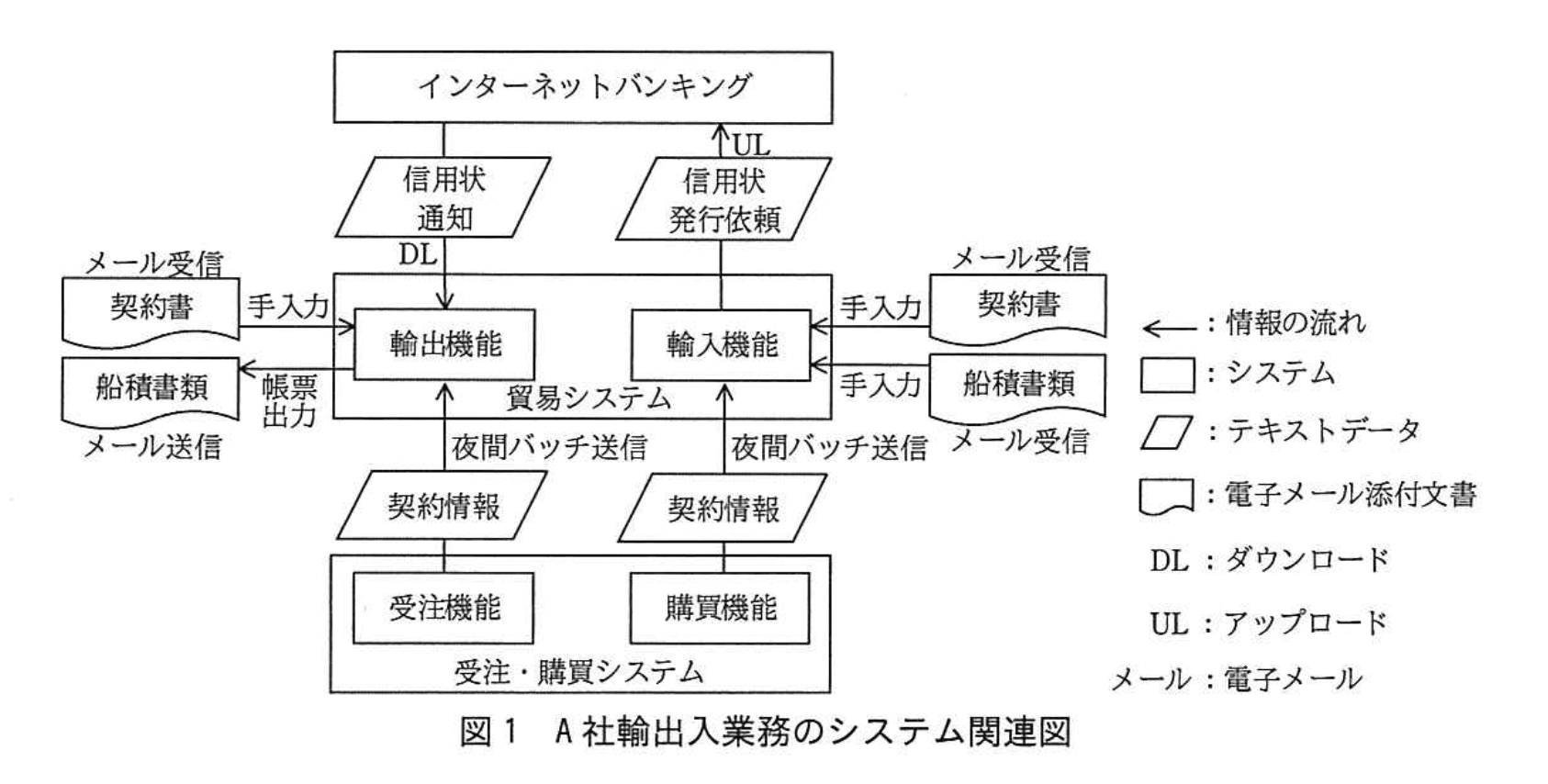 A社は、ITの活用によってA社輸出入業務の品質を向上させるに当たり、現状を把握することとした。A社輸出入業務のシステム関連図を、図1に示す。