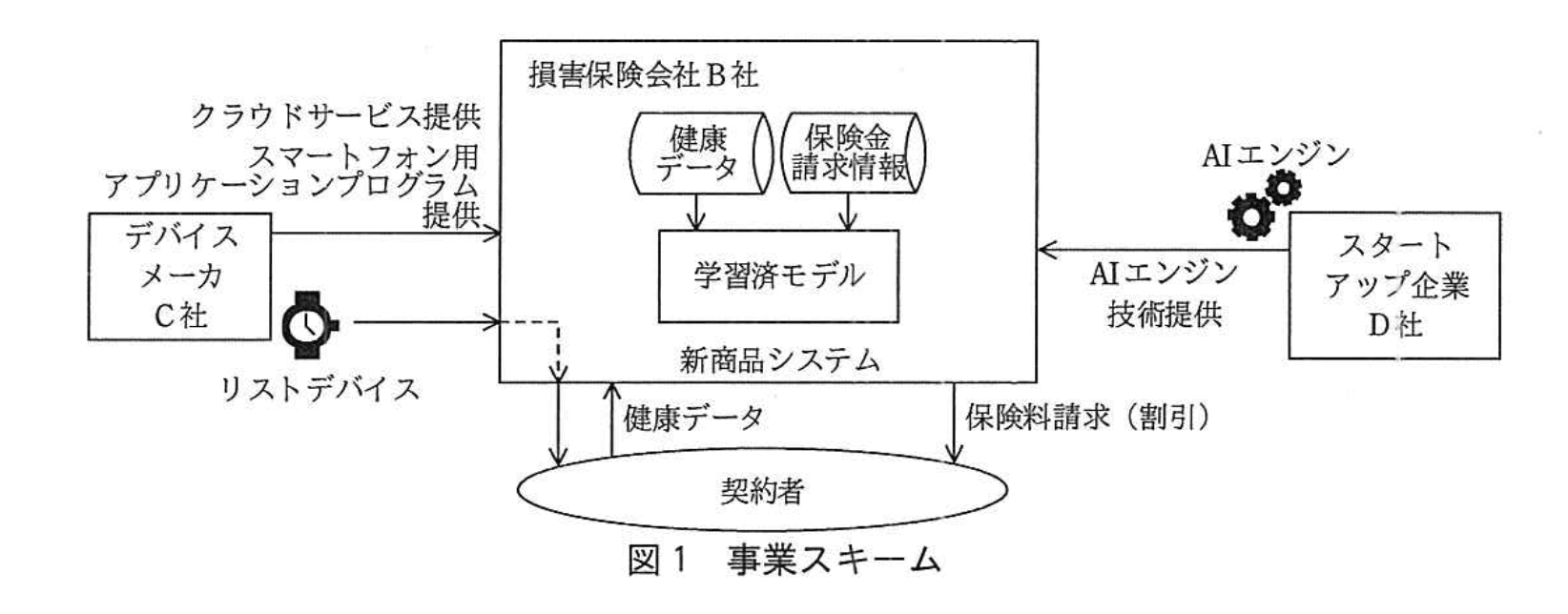 新商品を提供するには、センサ技術とAI技術の活用が必要になるので、取引先であるデバイスメーカーC社とスタートアップ企業D社と協議して、図1に示す事業スキームを構築することにした。その概要は次のとおりである。