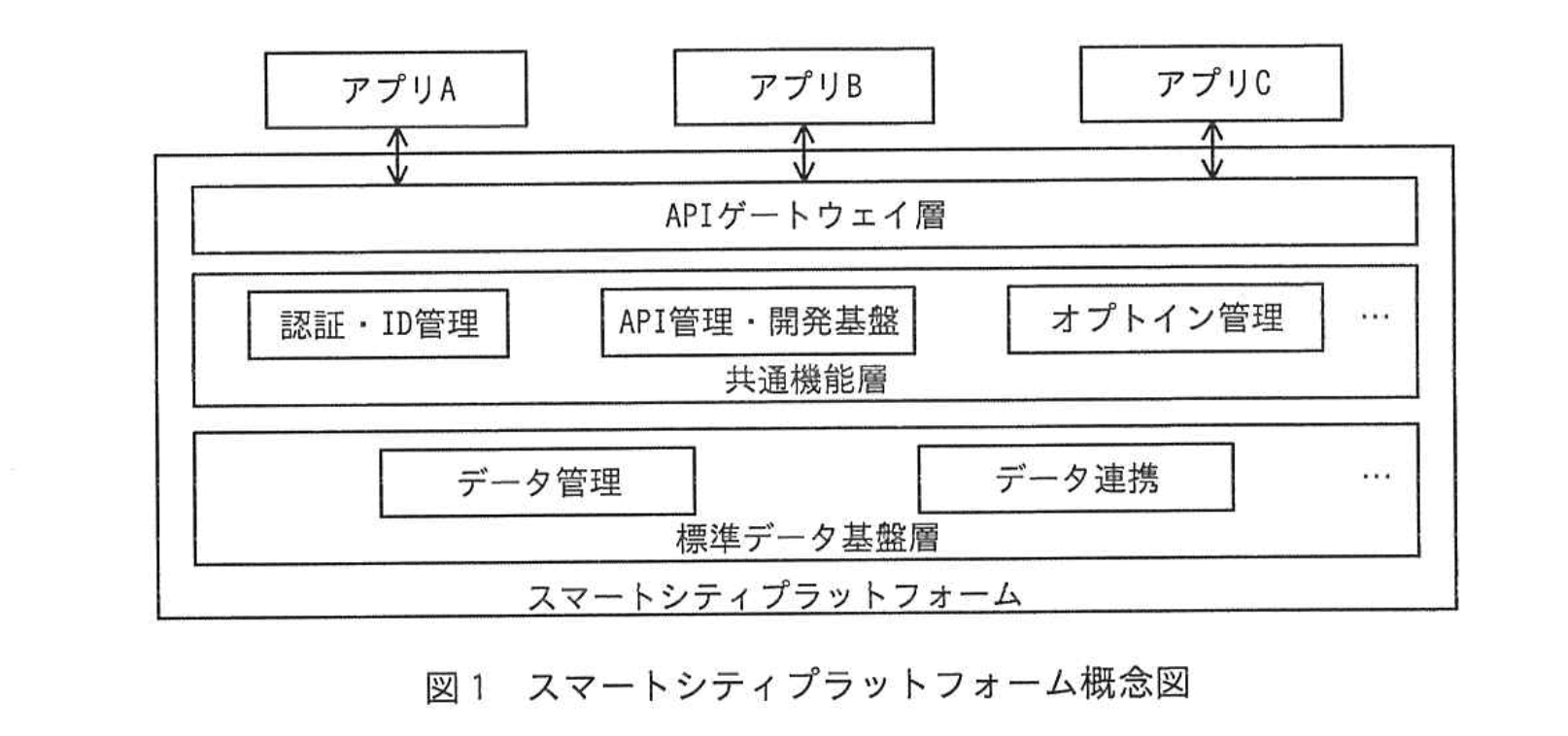 スマートシティプラットフォームの概念図は、図1のとおりである。スマートシティプラットフォームの上に地方創生を推進するサービスを提供するアプリケーションシステム(以下、アプリという)を実装する。