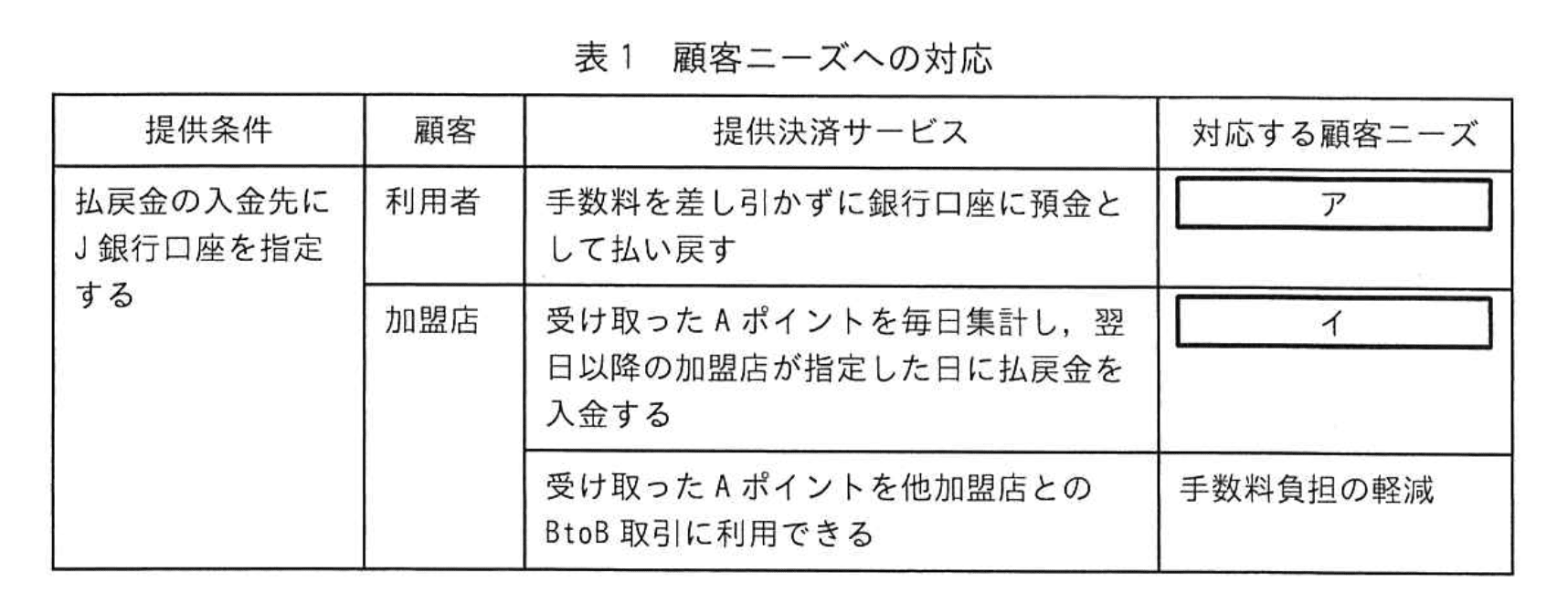 そこで A社は、J 銀行口座を保有する A-Pay の利用者と加盟店に、表1に示す決済サービスを提供し、J 銀行の決済サービスと A-Pay の決済サービスの相互利用時の利便性を強化することによって、顧客ニーズに対応することにした。
