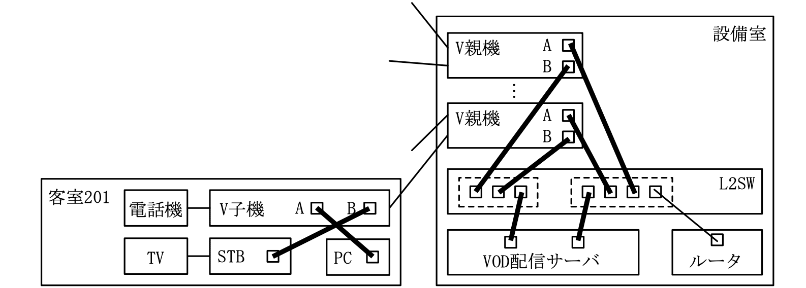 ・客室201:電話機→V子機、V子機A→PC、V子機B→STB、STB→TV