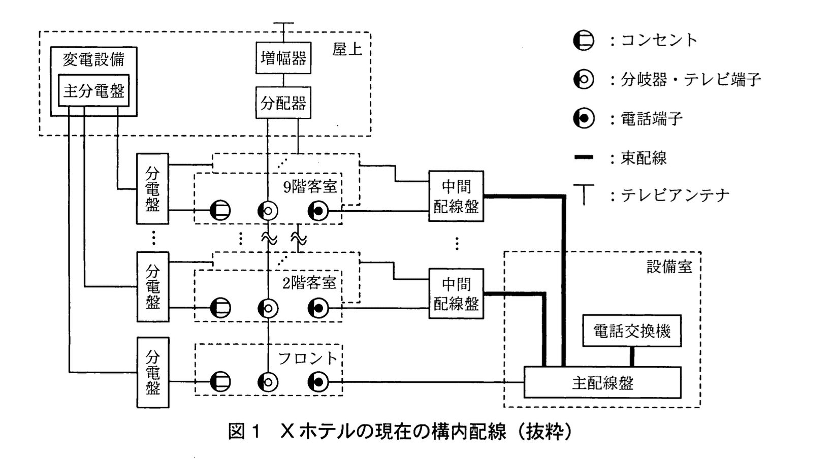 Z社のO主任は、各階の廊下にアクセスポイントを配置する無線LAN構成では、Xホテルの要件を満たせないと考え、現在の構内配線を伝送路として使うLAN構成を提案することにした。Xホテルの現在の構内配線は、図1のとおりである。