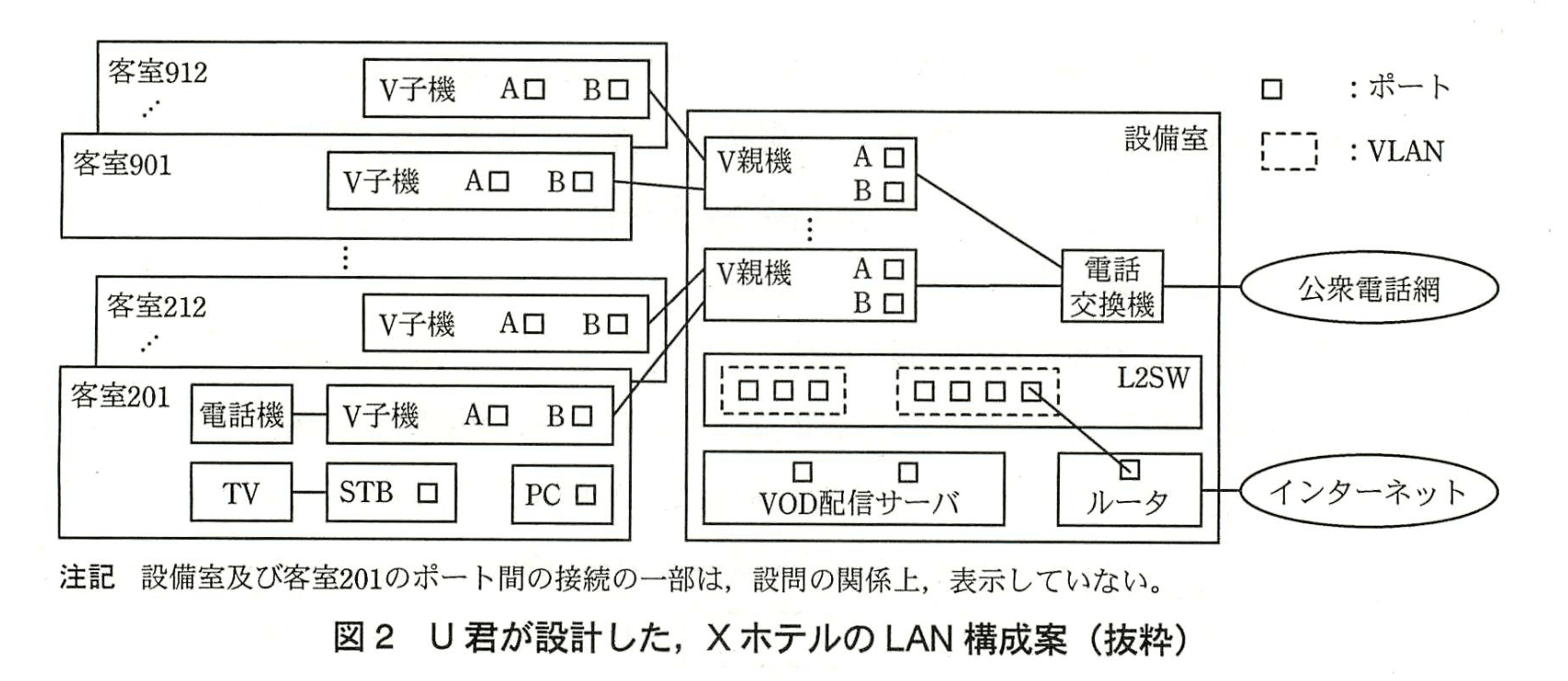 製品Vの親機(以下、V親機という)1台には、製品Vの子機(以下、V子機という)を25台収容できる。V親機及びV子機には、ポートA及びポートBの二つのLANポートがある。製品Vの工場出荷時の設定では、ポートAとポートBに別々のVLANが割り当てられ、V規模とV子機間の通信ではポートBの通信が優先されている。また、同じV規模に収容されている異なるV子機によっては、ポートA間及びポートB間の通信が遮断されている。本案件では、工場出荷時の設定のままで使用する。Xホテルで必要なV子機は81台で、V規模は最少でb台必要になるので、V規模のLANポートをL2SWに接続して束ねる。この構成では、迂断すべきV子機間の通信が可能になってしまうところがあるので、L2SWの機能で解決する。インターネット接続回線とL2SW間は、ルーターで接続する。U君が設計した、XホテルのLAN構成案を、図2に示す。