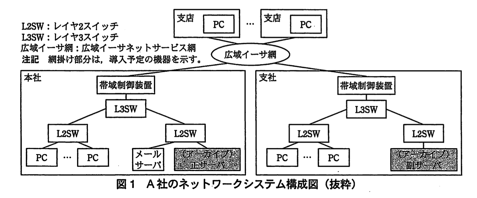 A社のネットワークシステム構成図(抜粋)を図1に示す。
