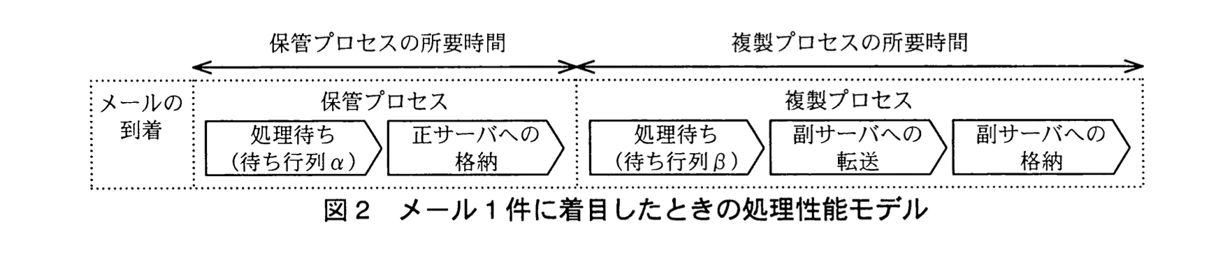 このモデルでは、メール1件に対する保管プロセスと複製プロセスを、二つの待ち行列と三つの処理に分解している。