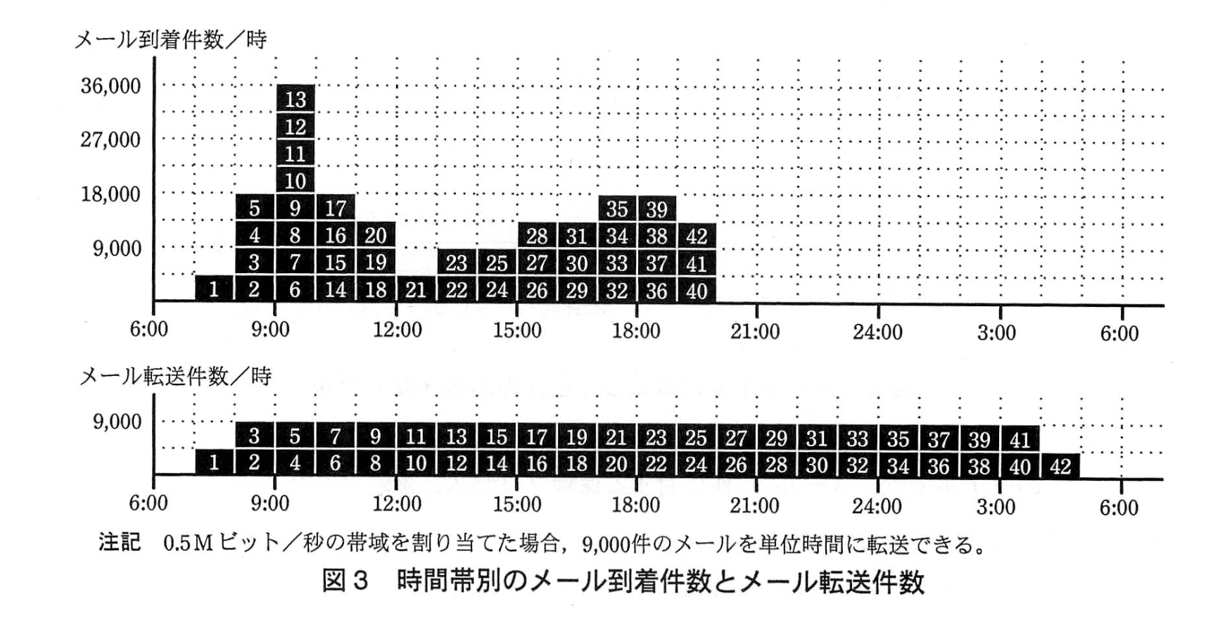 図3中の下段のグラフは、到着したメールが0.5Mビット/秒の帯域で順次転送される場合、どの時間帯に転送されるのかを示している。