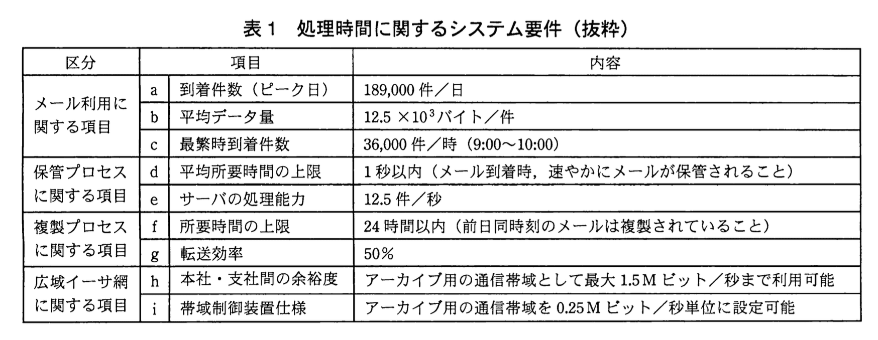 以上の検討から、B君は、広域イーサ網の帯域1.5Mビット/秒(表1中の項目h)のうち、0.5Mビット/秒を割り当てることで、アーカイブの所要時間に関する要件(表1中の項目d, f)を実現できることを、情報システム部長に報告した。
