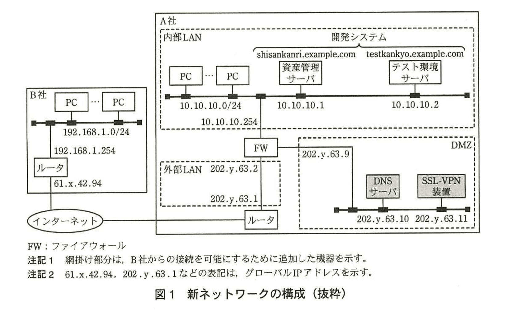 A社の情報システム部のM課長は、ネットワーク担当のN君に対し、ネットワーク構成とその運用を検討するように指示した。B社からの接続を可能にするためにN君が考えた、新ネットワークの構成を、図1に示す。