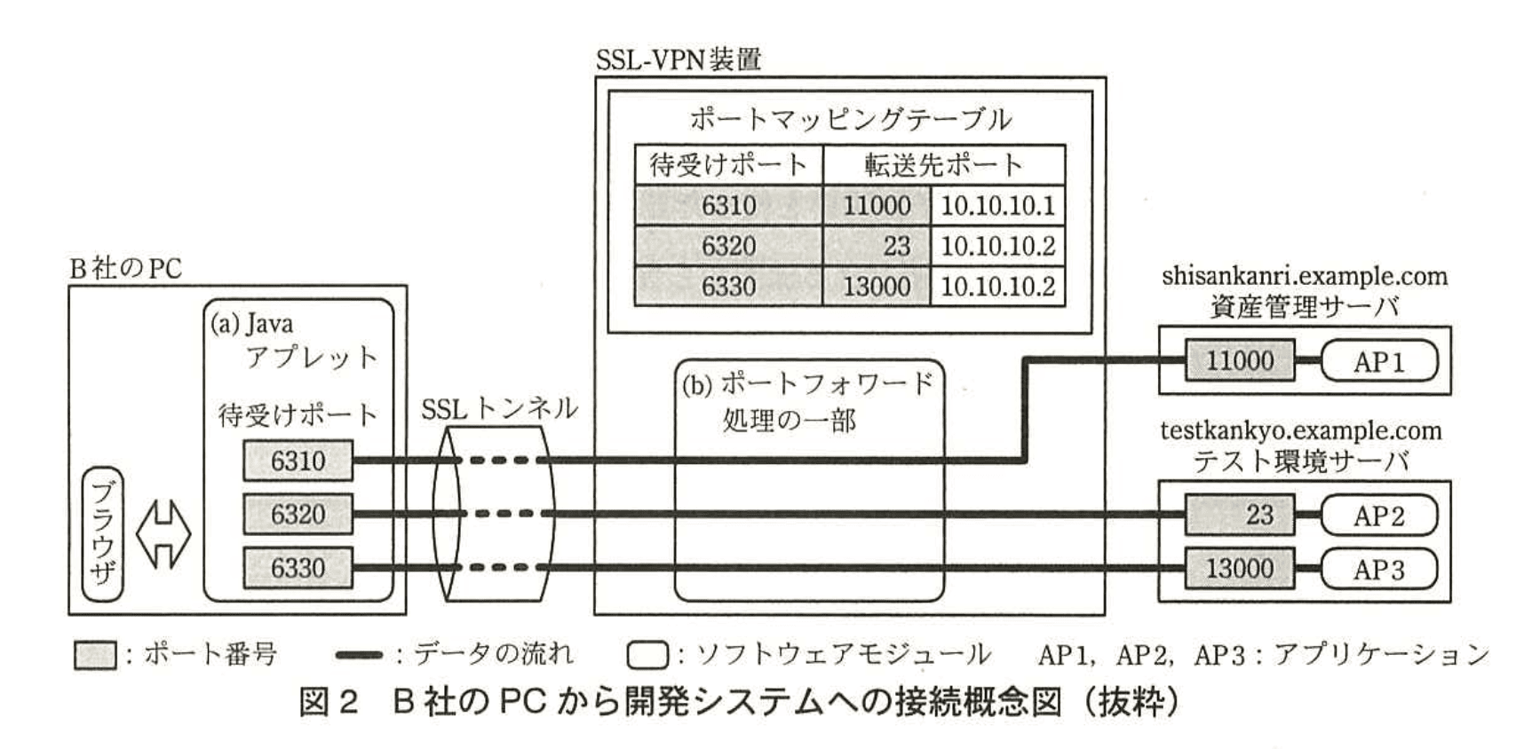 B社のPCでは、図2中で示した(a)において、Javaアプレットが事前に指定したポート番号で待ち受け、B社の開発者がPCのブラウザに表示されたメニューの中からアプリケーション名を選択することで、SSLトンネルを経由してSSL-VPN装置へアクセスデータを送る。SSL-VPN装置では、図2中で示した(b)において、ソフトウェアモジュールがポートマッピングテーブルを参照して、待受ポートとプライベートアドレスに対応する転送先ポートへデータを送る。②この方式では、使用できないアプリケーションが発生するが、今回の開発システムでは問題がないことをN君は確認した。また、SSL-VPN装置のログアウト時に、Javaアプレットがhostsファイルを編集前の設定に戻すことも確認した。さらに、N君は、開発作業のピーク時に開発システムの利用頻度が増大すると考慮し、③SSL-VPN装置において、SSLセッションのキャッシュ時間を延ばす設定を行うことにした。