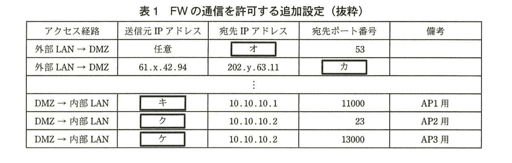 - ポート 53 と 443 を取り違え、オ に「202.y.63.11」を書いてしまう。