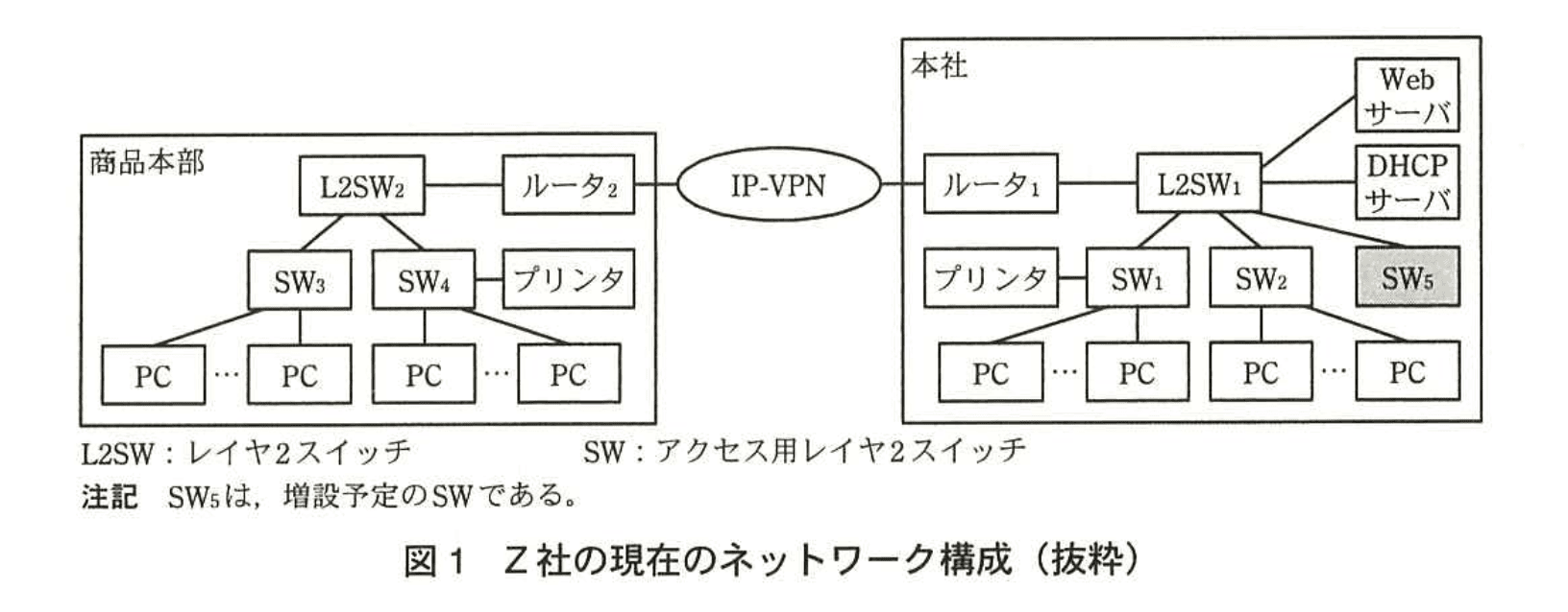 Z社は、生活雑貨の企画、製造及び販売を行う企業である。本社は東京にあり、商品の製造と配送を行う商品本部が山梨にある。ネットワーク管理は、本社の情報管理課が行っている。Z社の現在のネットワーク構成を、図1に示す。
