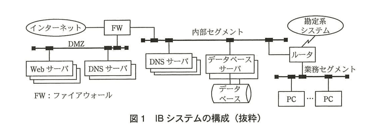 IB システムは、Webを使ったインターネット経由の顧客向けサービスである。IB システムは、勘定系システムで管理している口座残高などの情報を除き、独自のユーザID、パスワードなどの重要情報をデータベースに保存している。IB システムのWebサーバは、業務セグメントの PC からもアクセスできる。