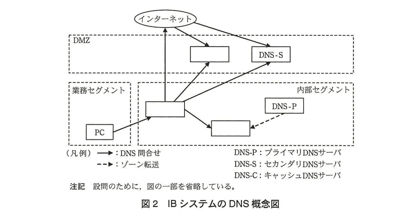 (2)本文中のセキュリティ対策を実施した場合の、図2中の空欄の DNS サーバと、DNS 問合せ及びゾーン転送について、凡例に従って図2を完成させよ。