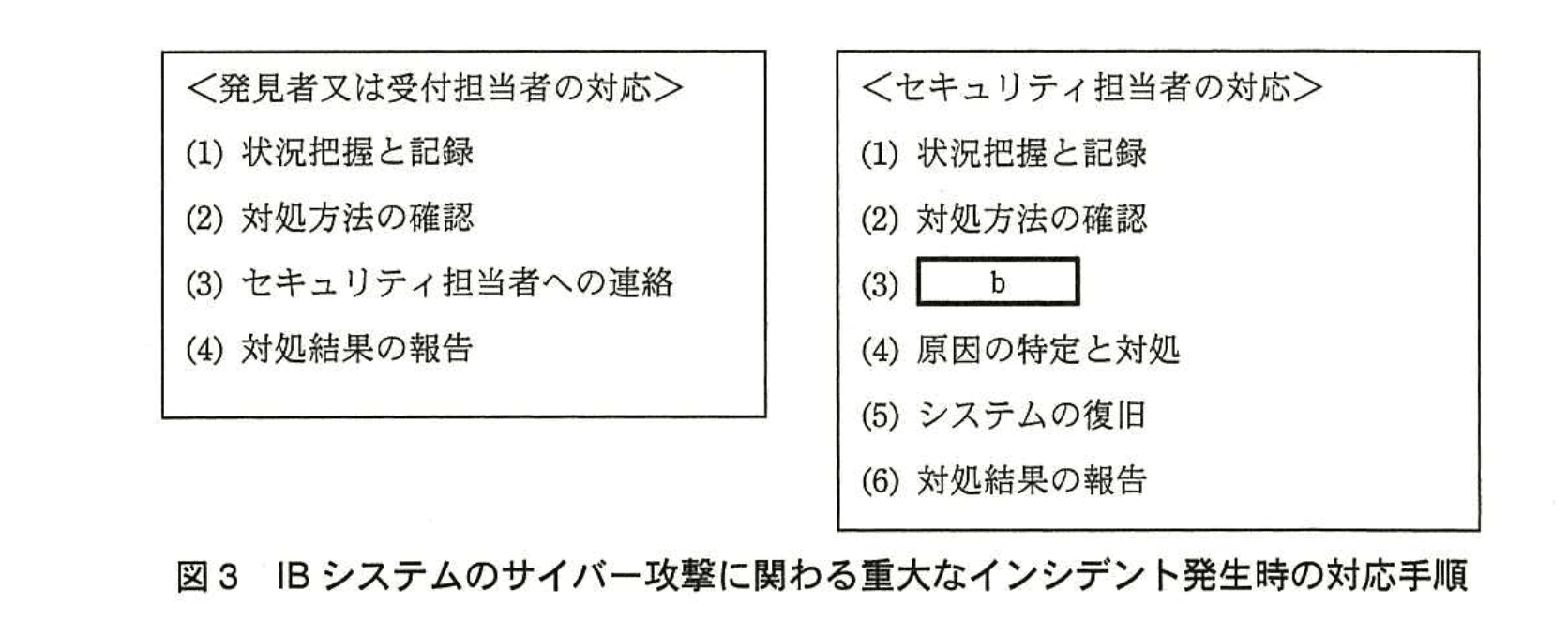 IBシステムにおいて、サイバー攻撃に関わる重大なインシデントが発生したときのために、X銀行が定めた対応手順を、図3に示す。