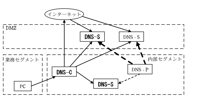 - 「内部セグメントの DNS サーバは、プライマリ、セカンダリ、キャッシュをそれぞれ別のサーバ機器で稼働させる。」