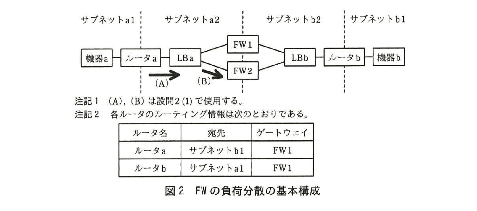 (1) ①FW はセッションの終端ノードではないので、FWの負荷分散では、パケットに対して行える操作に制約があり、サーバ負荷分散で使われる仮想IPアドレスを用いる方式は使えない。そこで、図2の LB によるパケット転送の動作は、次のとおりとなる。