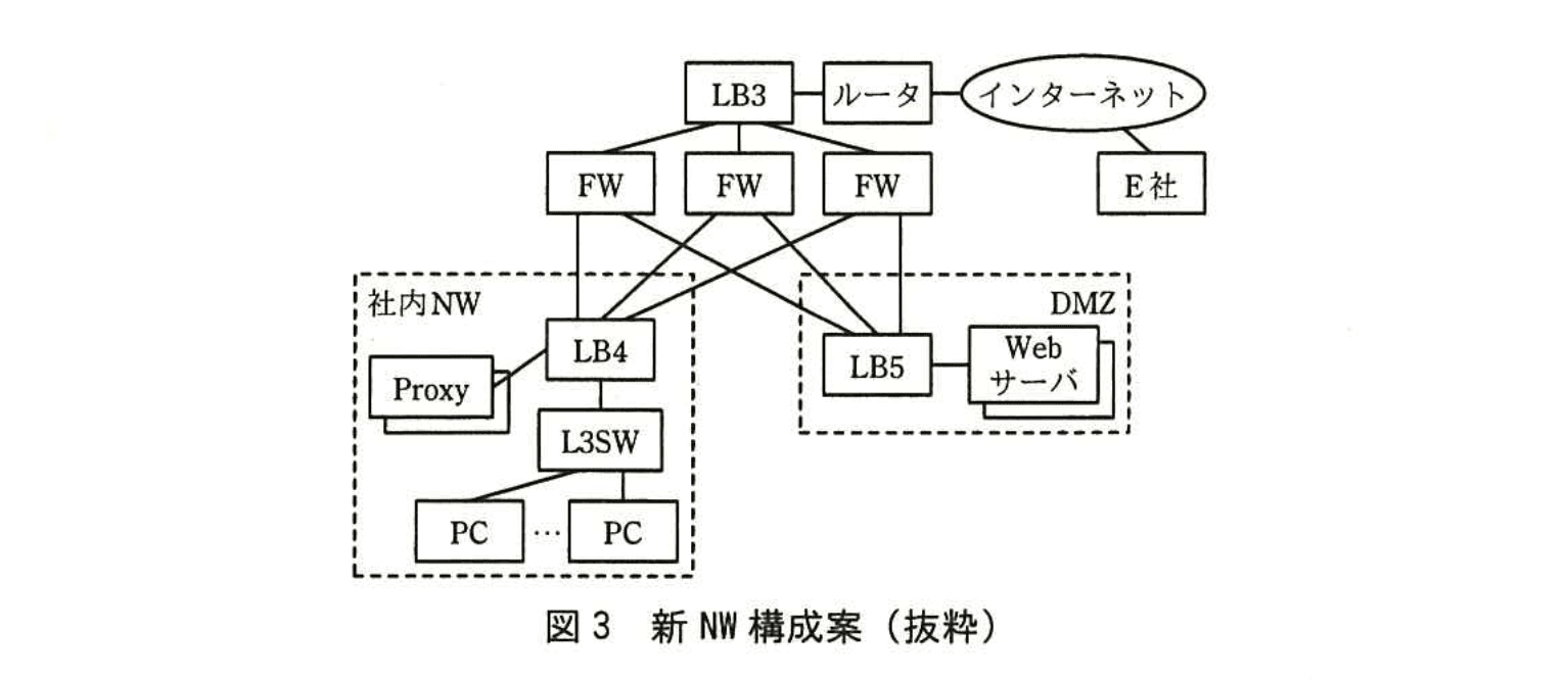 ・新 NW において、社内 NW に配置する LB には、Proxy の負荷分散と FWの負荷分散とを併用させる。DMZ に配置する LB には、Webサーバの負荷分散と FWの負荷分散とを併用させる。