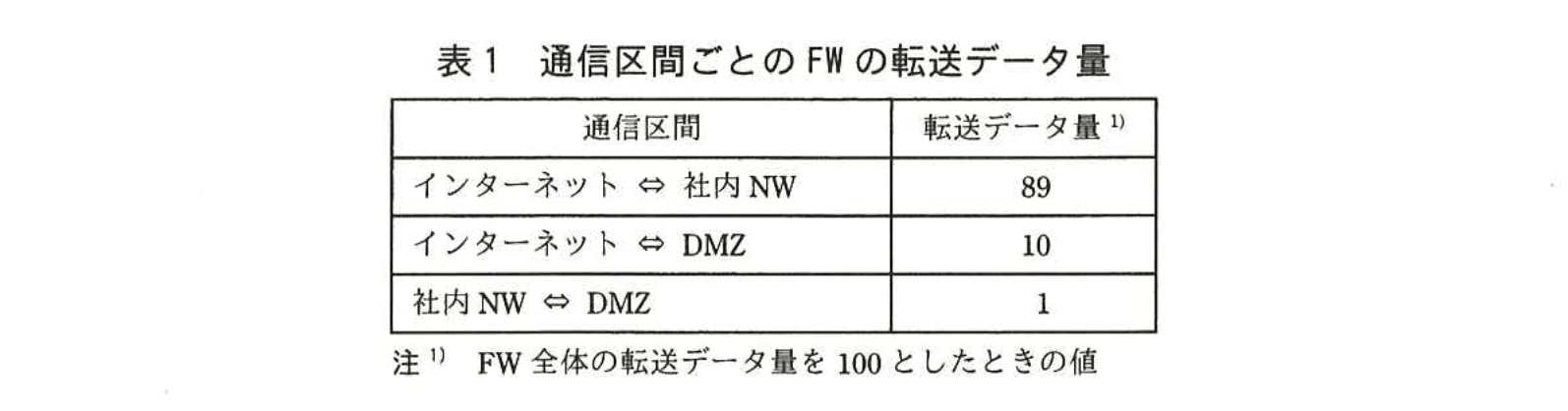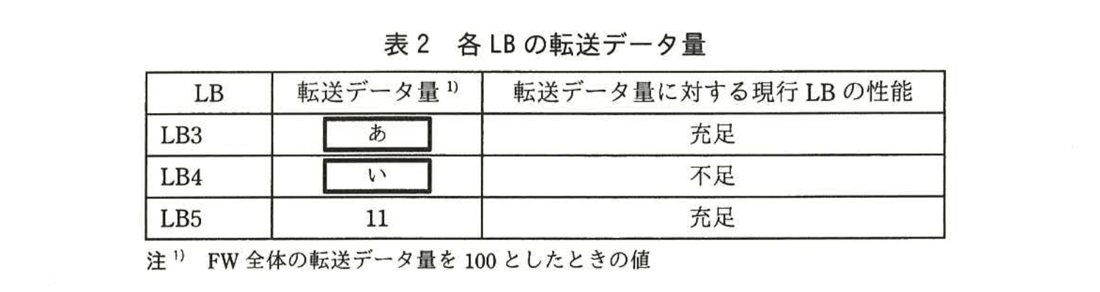 新NWにおける通信量の見積りによると、通信区間ごとのFWの転送データ量は、表1のとおりである。また、Proxyのキャッシュ効果、及びFWでのパケット破棄を無視し、表1に基づいて計算した各LBの転送データ量は、表2のようになる。