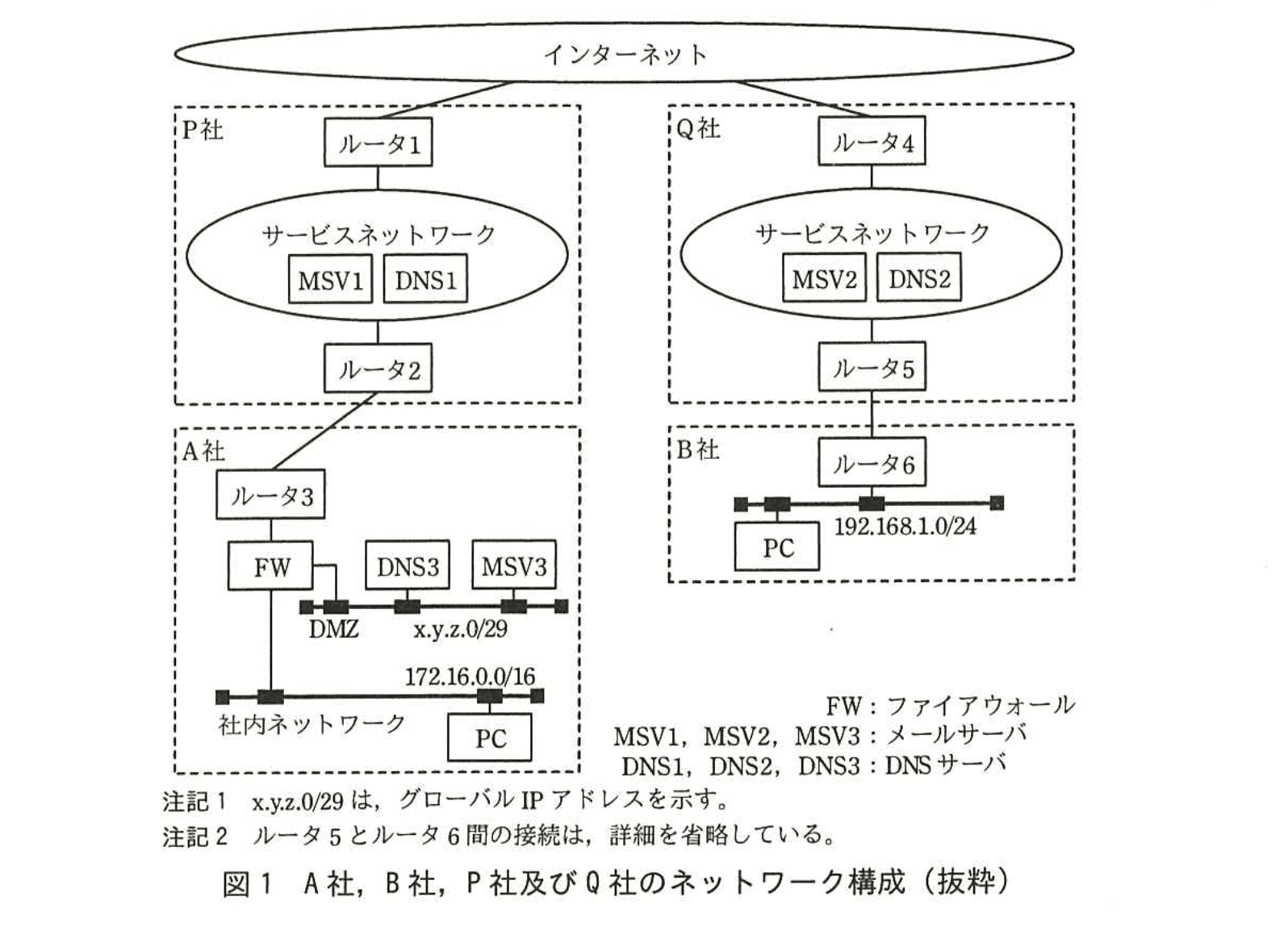 A社は、一般消費者向け製品を製造・販売している。現在、販売後の自社製品の購入者向けサポート業務(以下、サポート業務という)を自社内で行っているが、今後はサポート業務を B社に委託する方針である。サポート業務での購入者とのやり取りは、これまでは電話が中心であったが、電子メール(以下、メールという)を活用した運用を開始したところである。現在、A社は ISP である P 社のインターネット接続サービスを利用している。また、B社は ISP であるQ社のインターネット接続サービスを利用している。A社、B社、P 社及びQ社のネットワーク構成を、図1に示す。