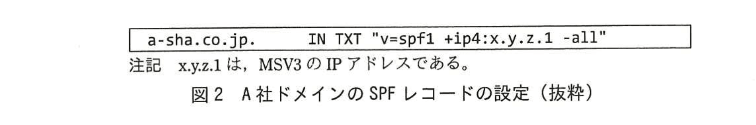 A: “a-sha.co.jp”を騙る外部メールサーバからの送信を、受信側がDNSのSPFレコード照合で検証し、不正と判断したメールを拒否・隔離できます。