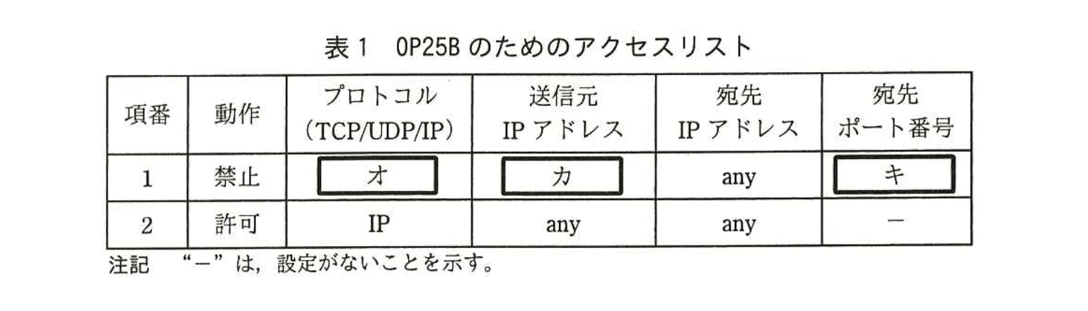 【問題文】で“③ TCP の 587 番ポート”と明示されている点を見落とさないこと。 - “外部からDMZ” の方向を読み違え、社内→外部のフィルタ条件と混同してしまうケース。