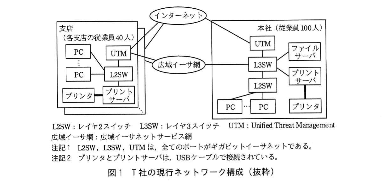 各拠点は広域イーサ網で接続されており、アクセス回線の契約帯域は、本社が1Gビット/秒、各支店が100Mビット/秒である。インターネット接続回線は、拠点ごとに契約しており、契約帯域は本社が100Mビット/秒、各支店が40Mビット/秒である。