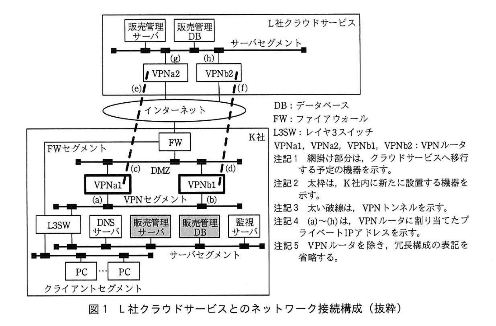 図1の L社クラウドサービスとのネットワーク接続構成の概要は、次のとおりである。