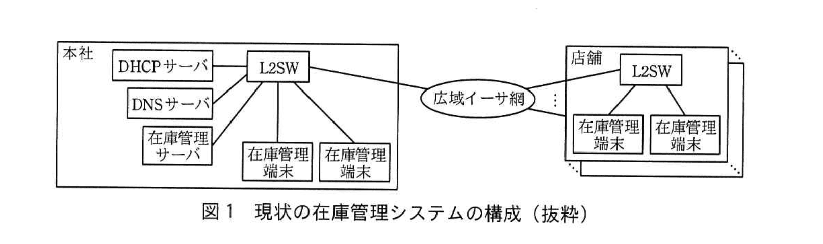 「在庫管理システムは、本社の在庫管理サーバ、DHCPサーバ、DNSサーバ、本社及び店舗に2台ずつある在庫管理端末、並びにこれらを接続するレイヤ2スイッチ(以下、L2SWという)から構成される。」とある。