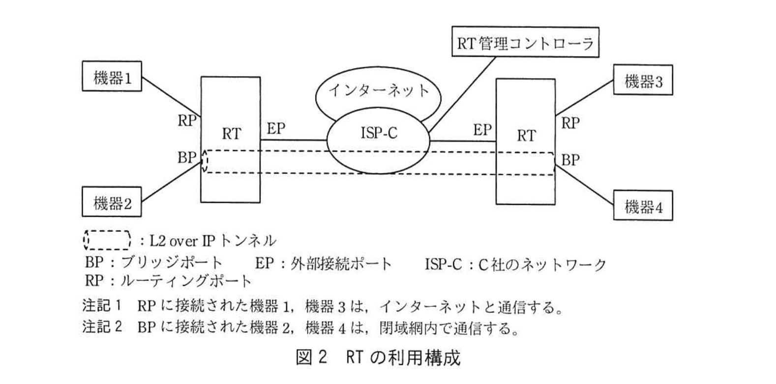 Bさんは、本社と店舗との接続に、インターネット接続事業者である C社が提供する法人向けソリューションサービスを利用することを考えた。このサービスでは、インターネット上に L2 over IP トンネルを作成する機能をもつルータ(以下、RTという)を用いる。RTの利用構成を図2に示す。