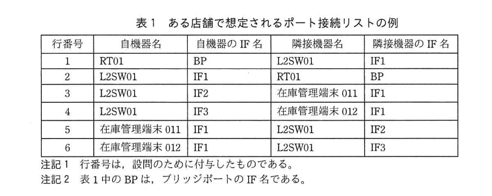 ポート接続リストとは、b で情報を取得する対象の機器(以下、自機器という)の IF と、そこに接続される隣接機器の IF を組み合わせにした表である。ある店舗で想定されるポート接続リストの例を、表1に示す。