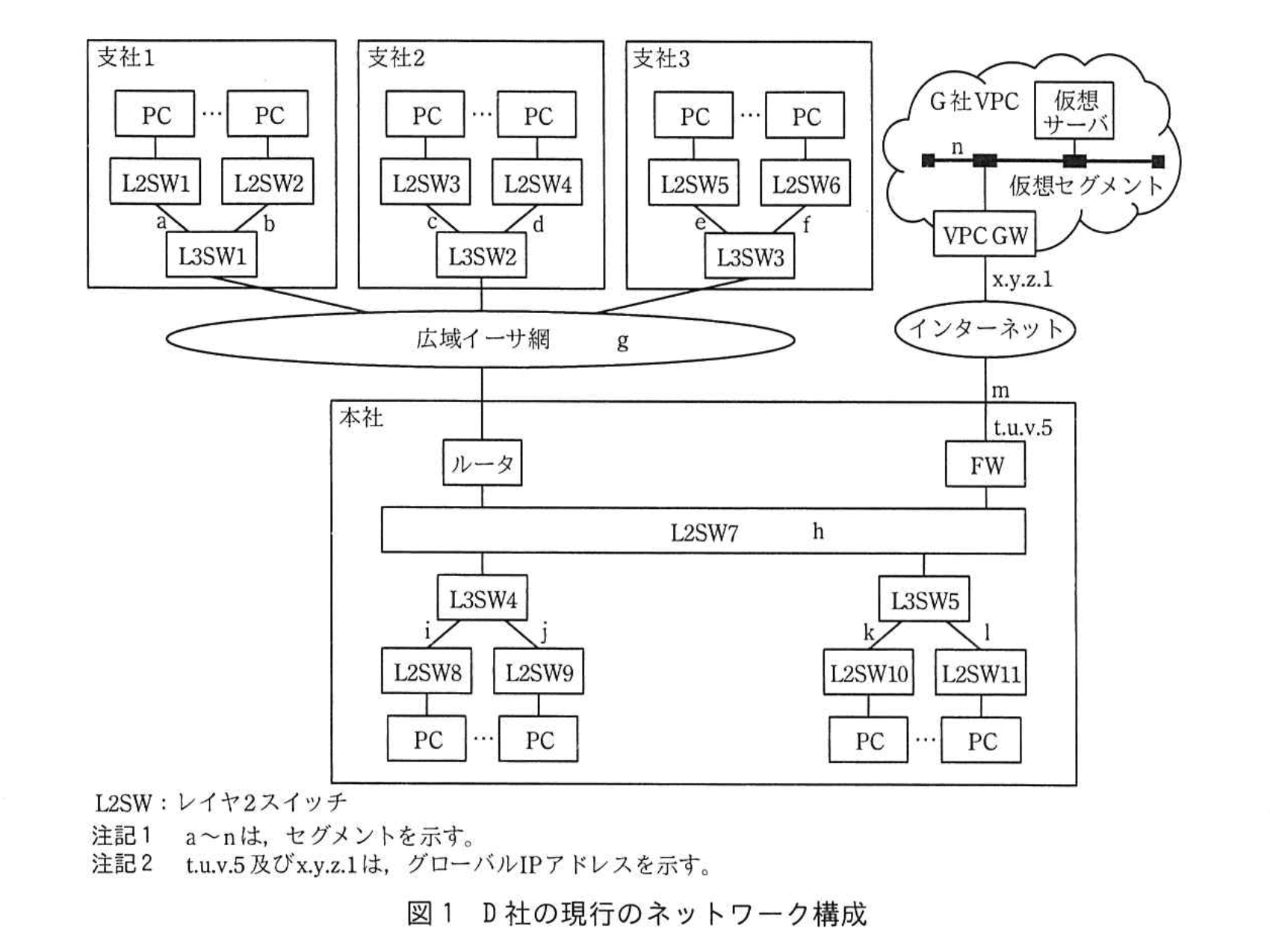 (1)本文中の下線⑤について、到達できないD社内ネットワーク部分を、図2中のa~lの記号で全て答えよ。