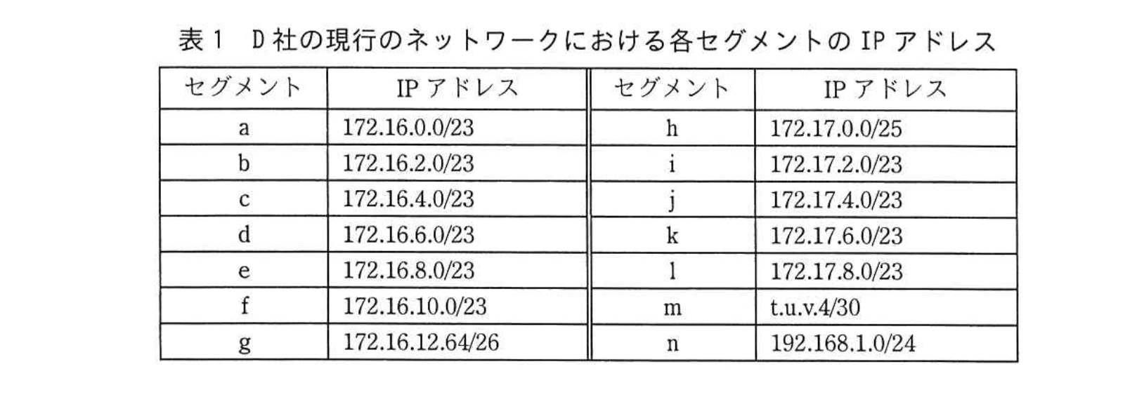 D社の現行のネットワークにおける各セグメントのIPアドレスを表1に示す。