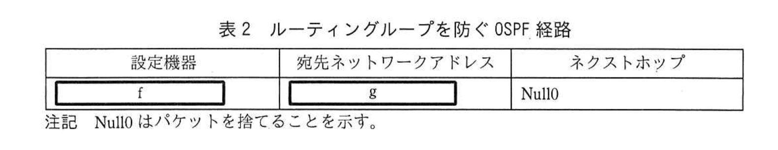 【問題文】では「支社ネットワーク集約によって意図しない④ルーティングループが発生しないようにすることを防ぐための設定」と述べ、表2 に「ネクストホップ Null0」とあります。OSPF で経路集約を行う際、個別経路が届かない場合にパケットがループしないよう、集約先ネットワークを Null0 に静的にルーティングするのが定石です。 -