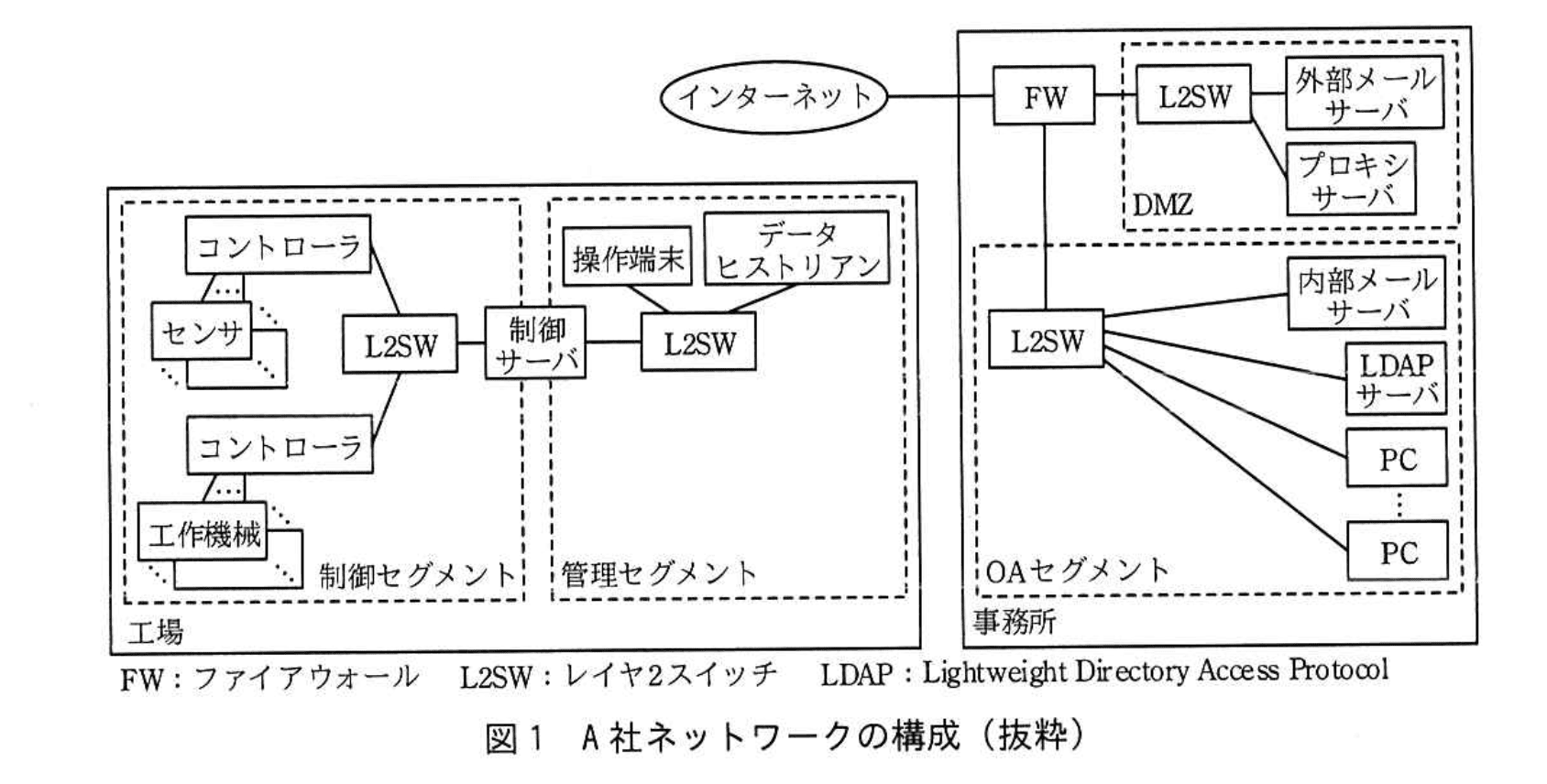 事務所には電子メール(以下、メールという)送受信やビジネス資料作成などのためのOAセグメントと、社外との通信を行うDMZが設置されている。工場には工作機械やセンサを制御するための制御セグメントと、制御サーバと操作端末のアクセスログ(以下、ログデータという)や制御セグメントからの測定データを管理するための管理セグメントが設置されている。