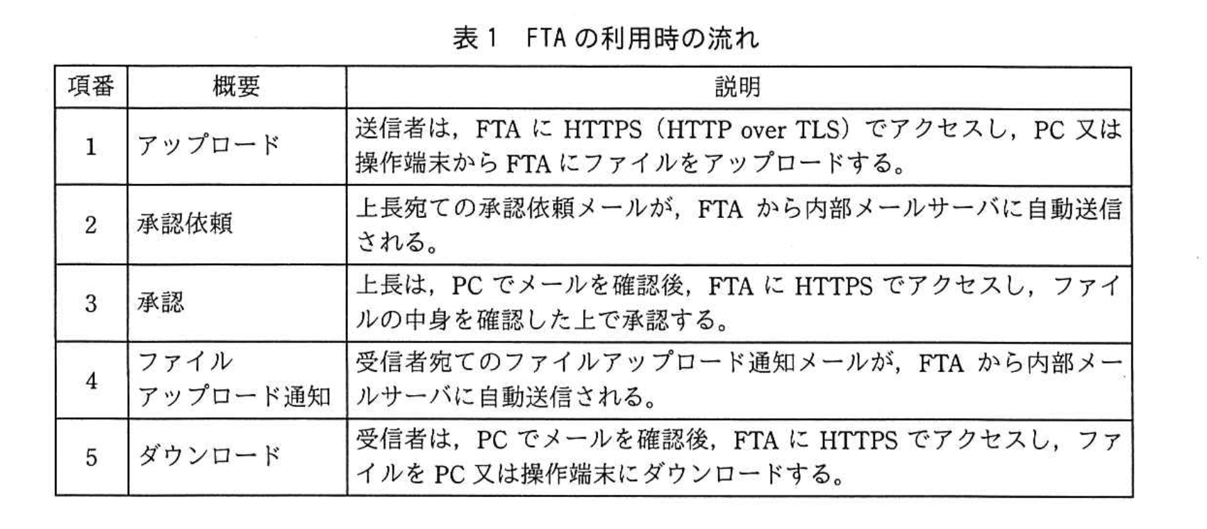 FTAは、分離された二つのネットワークでルーティングすることなくファイルの受渡しができるアプライアンスである。ファイルの送信者は、①FTAにWebブラウザを使ってログインし、受信者を指定してファイルをアップロードする。ファイルの受信者は、FTAにWebブラウザを使ってログインし、自身が受信者として指定されたファイルだけをダウンロードできる。