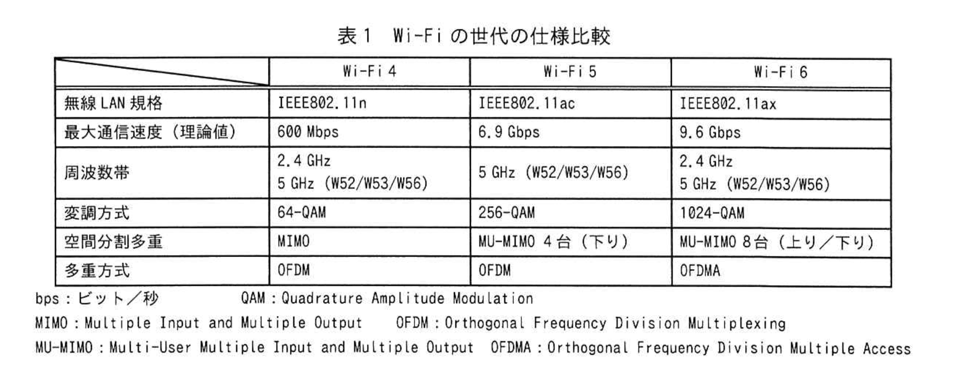 B主任は始めにWi-Fi6について調査した。Wi-Fiの世代の仕様比較を表1に示す。