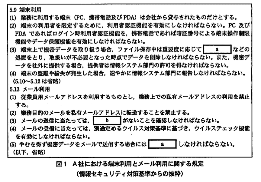 → 価格表という機密データがメールとして端末に残存しており、漏えいに至ったため、この規定の“保存中の保護”と“不要時の削除”が守られていません。 - 【図1】5.13(5)