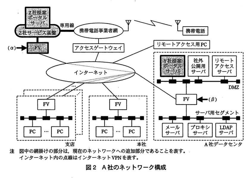 図2では、(α)側のFVは「Z社が運営するサービス基盤」へ、(β)側のFVは「A社データセンタ」のDMZ‐内FVへ接続しています。したがって、ここを流れる通信は “Z社提案ポータルサーバ ↔ A社内サーバ群” のトラフィックです。 -