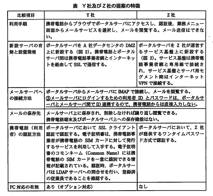 携帯電話端末にメールが保存されないようにしたいとの要望や、会社貸与の携帯電話の事業者は 1 社であるといった現状を、F主任が情報システムベンダ各社に伝えてSシステムの提案を求めたところ、Y社とZ社の2社から提案があった。 F主任は、図2に示すように、A社の現在のネットワーク構成図に Y社と Z社の提案の構成を書き加えるとともに、2社の提案の特徴を表にまとめて比較した。