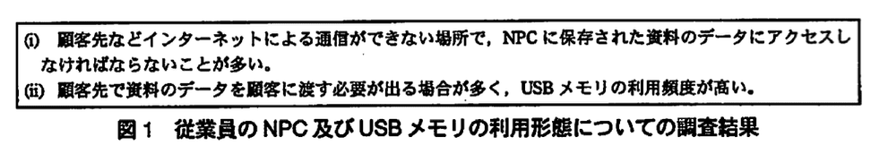 図1の調査結果で「顧客先で資料のデータを顧客に渡す必要が出る場合が多く、USBメモリの利用頻度が高い。」とあります。