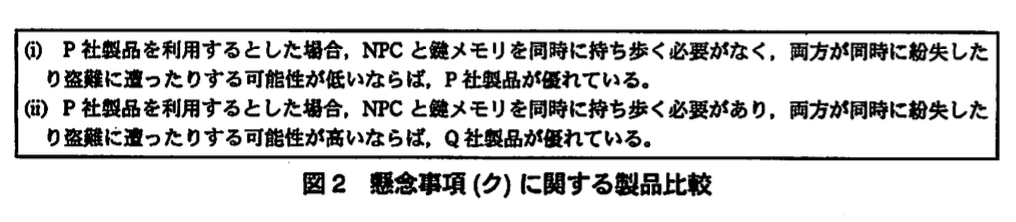 - 図2の(i)では、「NPCと鍵メモリを同時に持ち歩く必要がなく、両方が同時に紛失したり盗難に遭ったりする可能性が低いならば、P社製品が優れている。」と示されています。