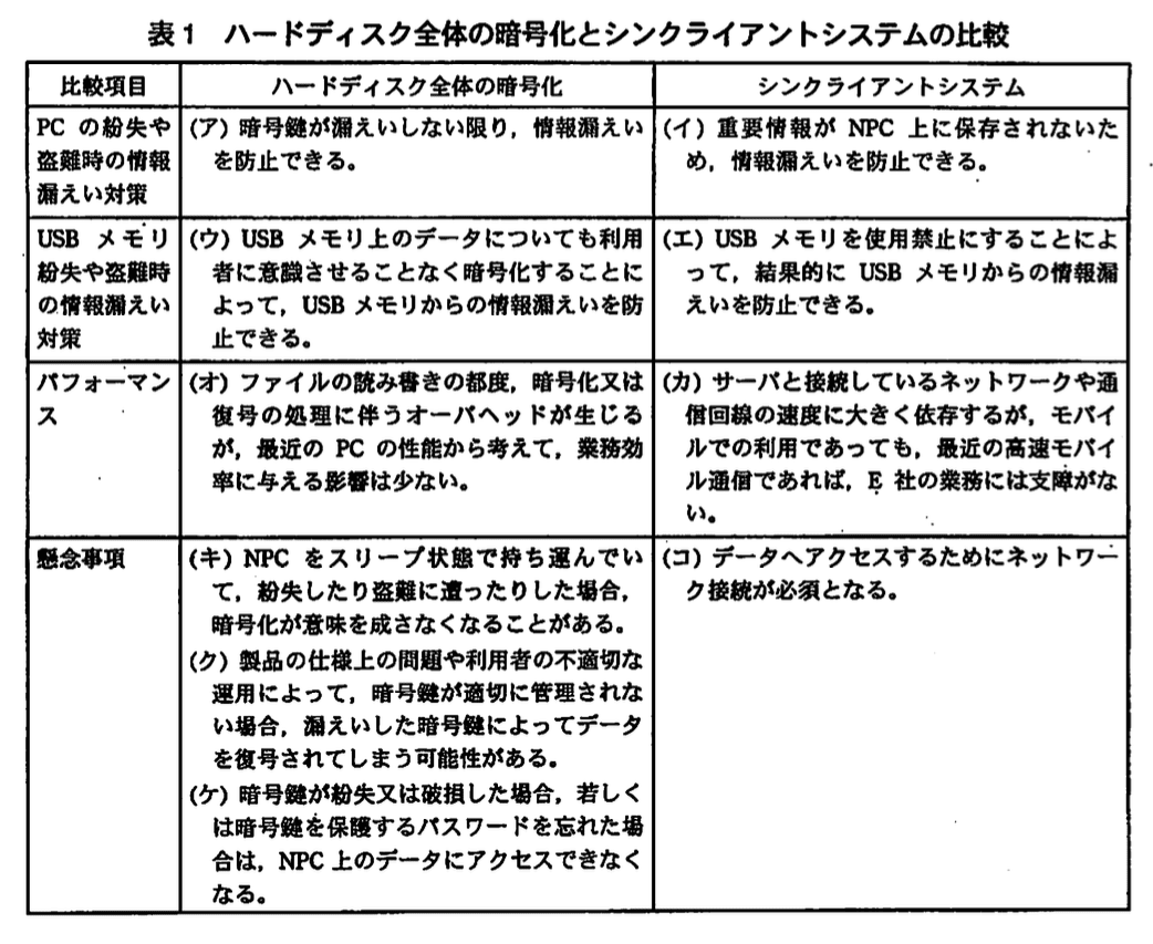 シンクライアントシステムによる対策は、aやbといった点から、ハードディスク全体の暗号化による対策に比べて情報漏えいのリスクをより小さやくできる点が評価されたものの、bやcといった点が現状のE社の業務形態に合わない点が問題とされた。 一方、ハードディスク全体の暗号化による対策には、表1中の (キ)、(ク)、(ケ) といった懸念事項があるものの、いずれも技術的に対応可能であると考えられた。